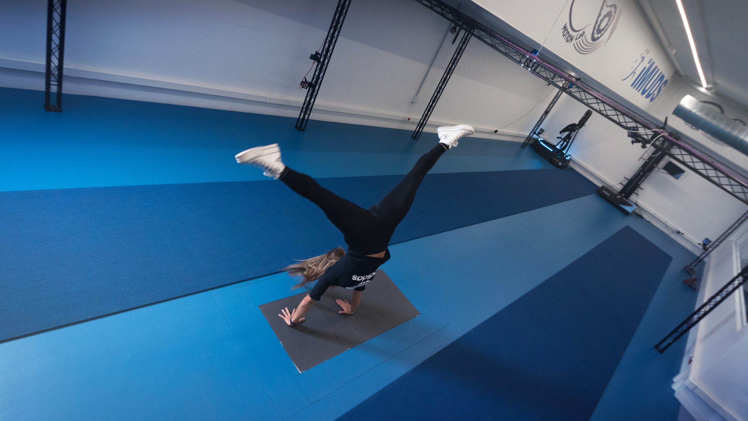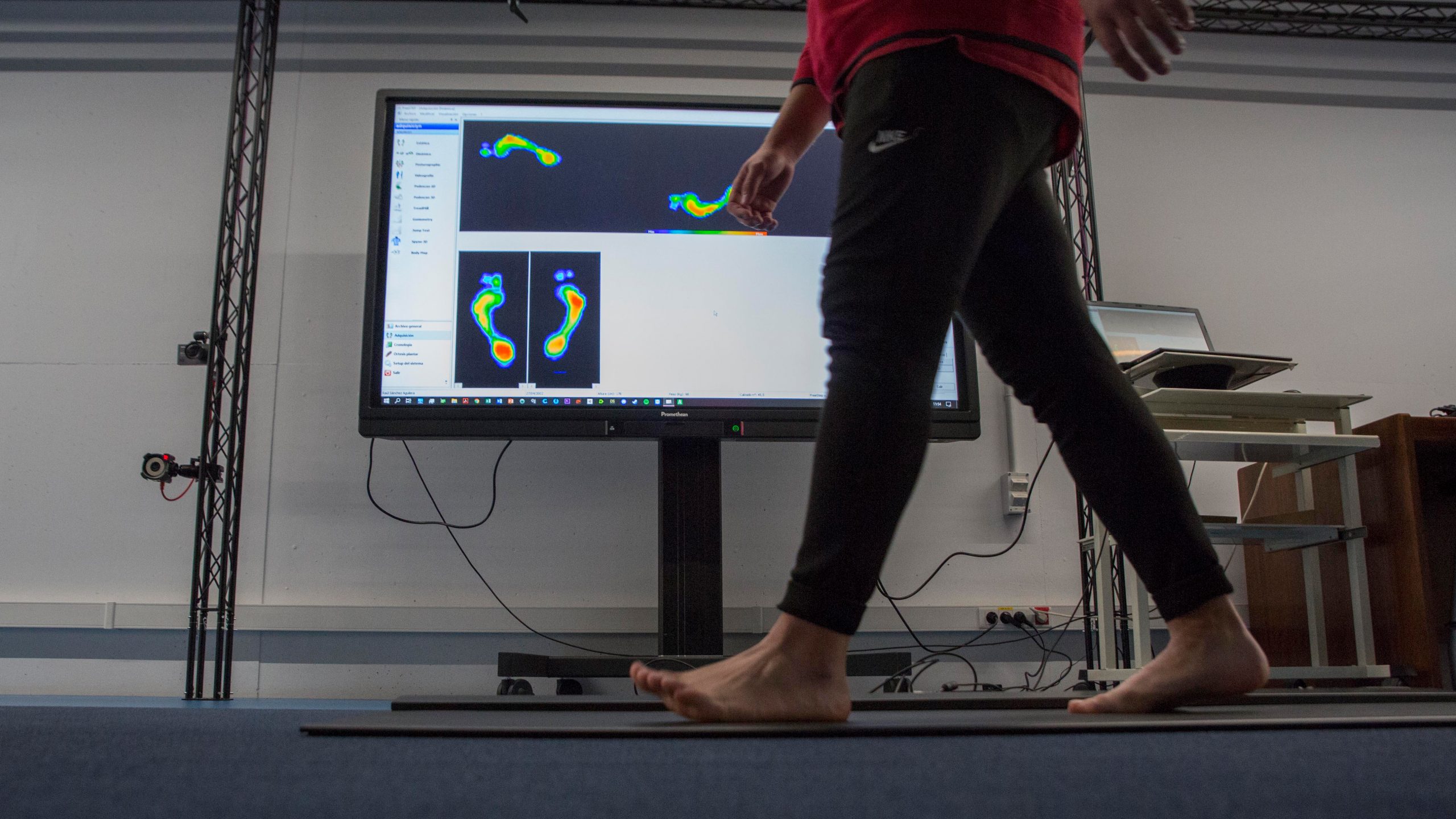 Las plataformas de fuerzas triaxiales son dispositivos utilizados para medir la fuerza de reacción ante la aplicación de fuerzas provocadas por la interacción humana sobre ellas (caminando, corriendo, saltando, realizando cambios de dirección, pruebas de equilibrio, etc.). Son el gold estándar para la evaluación de alto nivel de indicadores de fuerza, potencia mecánica, momentos de fuerza. Disponemos de 4 plataformas triaxiales, de las prestigiosas marcas Kistler y Bertec, estando ubicadas en superficies de suelo, perfectamente encastradas, que facilitan la realización de todo tipo de gestos, especialmente los de locomoción humana. Este tipo de plataforma permite realizar análisis biomecánicos, de indicadores de rendimiento deportivo, condición física, ergonomía, postura, y factores de riesgo músculo-esquelético. Los datos obtenidos son esenciales para evaluar el comportamiento dinámico, permitiendo optimizar a tiempo real el movimiento realizado en ellas. El uso combinado de plataformas de fuerza triaxiales sincronizadas con sistemas fotogramétricos ofrece un excelente nivel de análisis en cuanto a precisión y validez científica. Su uso es muy habitual en áreas no solo del ámbito deportivo y del ejercicio físico, sino también en fisioterapia, podología, rehabilitación, recuperación, análisis de la interacción del pie humano sobre el suelo y la influencia del calzado, y todo tipo de ortesis (plantares, articulares, etc.).